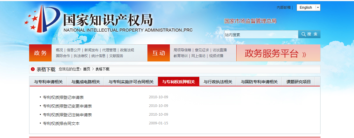 其中,专利权质押登记申请表、专利权质押登记注销申请表、专利权质押合同可在国家知识产权局官网下载,网址如下: